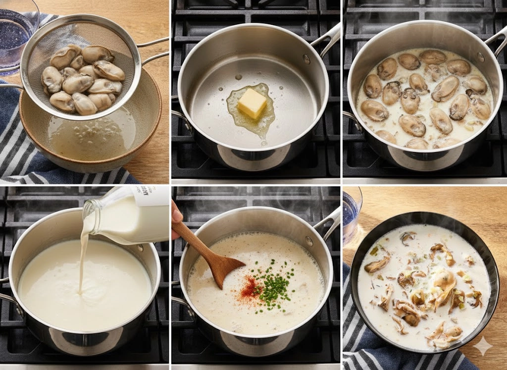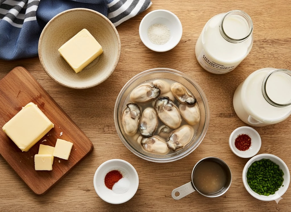- Salt to taste (be cautious, as the oyster liquor is naturally saline).