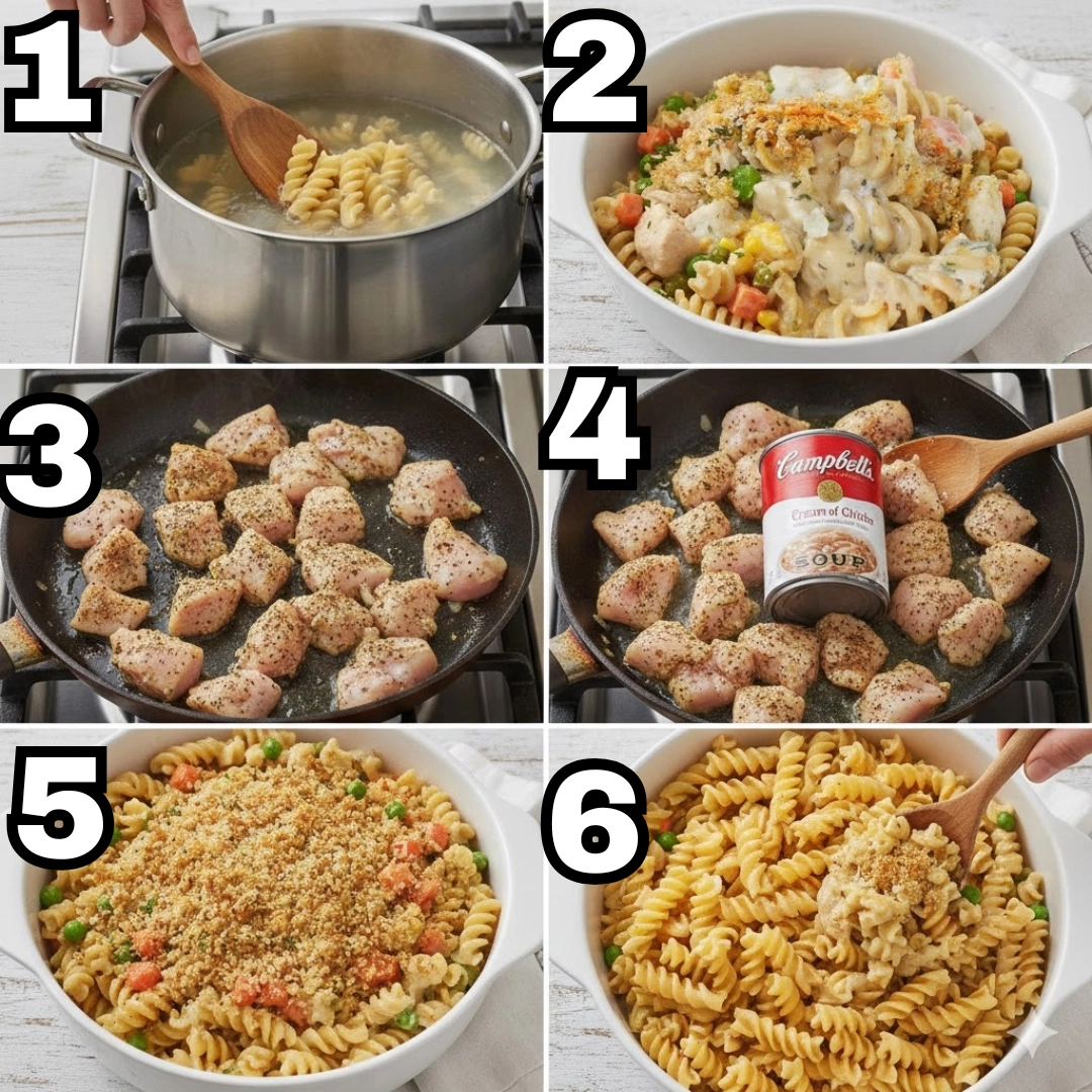 - In the same skillet (or a large mixing bowl), combine the cooked chicken with the boiled fusilli pasta, the can of condensed cream of chicken soup, the can of condensed cream of mushroom soup, and the frozen mixed vegetables. Stir the mixture thoroughly until every piece of pasta and chicken is coated in the creamy sauce. Transfer this mixture into your prepared baking dish.
