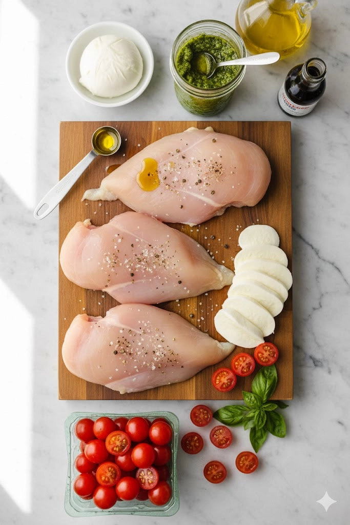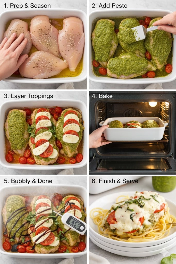 - Arrange the Topping: Layer the sliced mozzarella or bocconcini evenly over the pesto. Scatter the halved tomatoes around and over the chicken in the dish.
