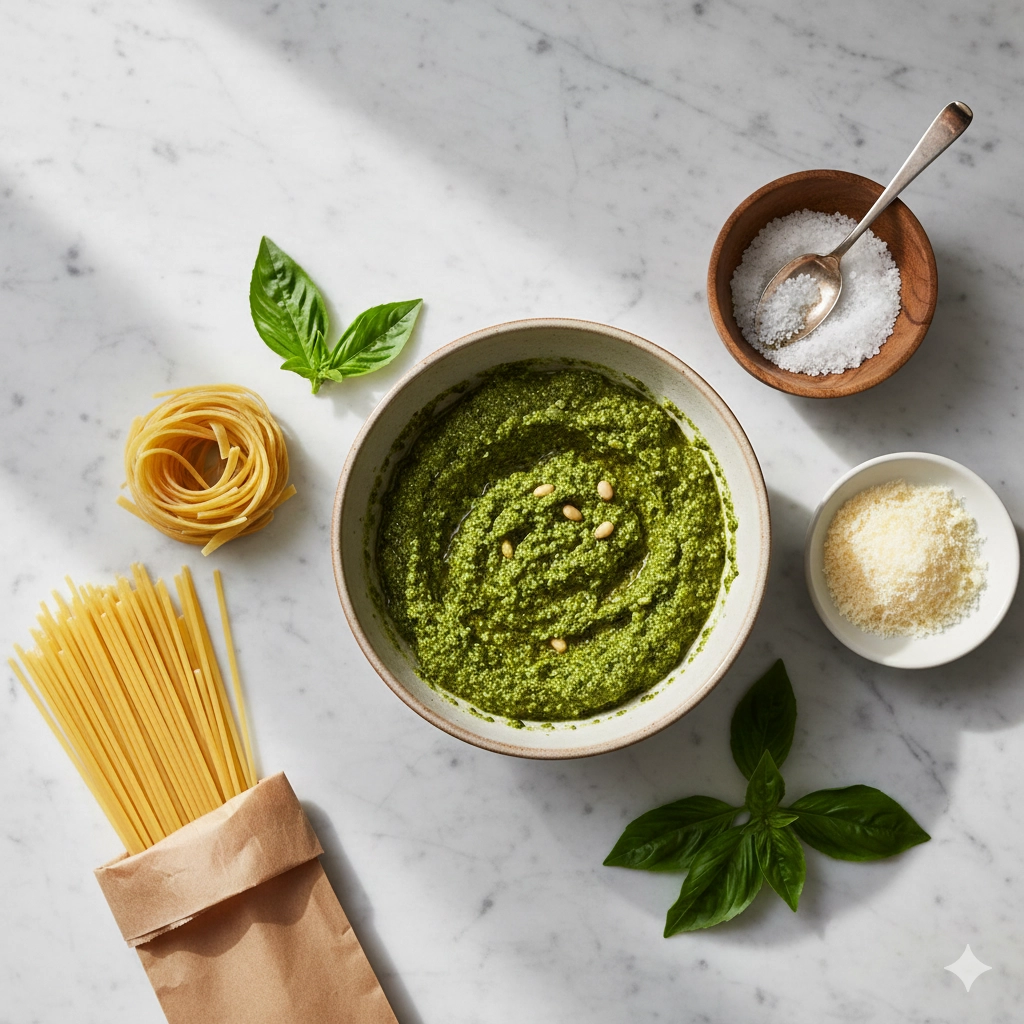 To truly excel at this dish, one must respect the temperature. Pesto is a “raw” sauce by nature; the basil is fresh and the cheese hasn’t been melted. While we do simmer it briefly to create the emulsion, you must be careful not to subject the pesto to extreme, prolonged heat. Boiling the pesto for too long can cause the vibrant green color to turn a muddy olive brown and can make the garlic taste bitter. Keep your heat at medium-low and stop the moment the sauce reaches that perfect, glossy thickness.