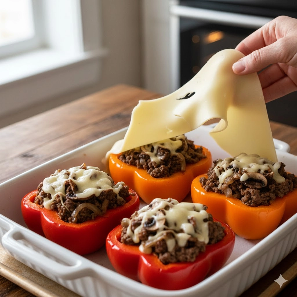 - Fill each pepper half with the beef mixture. Top with 2 slices of Provolone or shredded cheese.