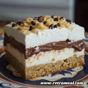 The Piggy Pudding Dessert Cake is a multi-layered chilled confection that balances a buttery, nutty shortbread base with smooth cream cheese and rich chocolate. Often referred to as a “four-layer delight” or “lush,” this specific version earns its playful name from its indulgent, moreish nature that makes it nearly impossible to stop at just one square. It is a staple for large gatherings, potlucks, and family celebrations where a crowd-pleasing, make-ahead dessert is required. Because it utilizes a combination of baked crust and no-bake fillings, it offers a sophisticated profile of textures ranging from a crisp, toasted walnut bottom to a billowy whipped topping.