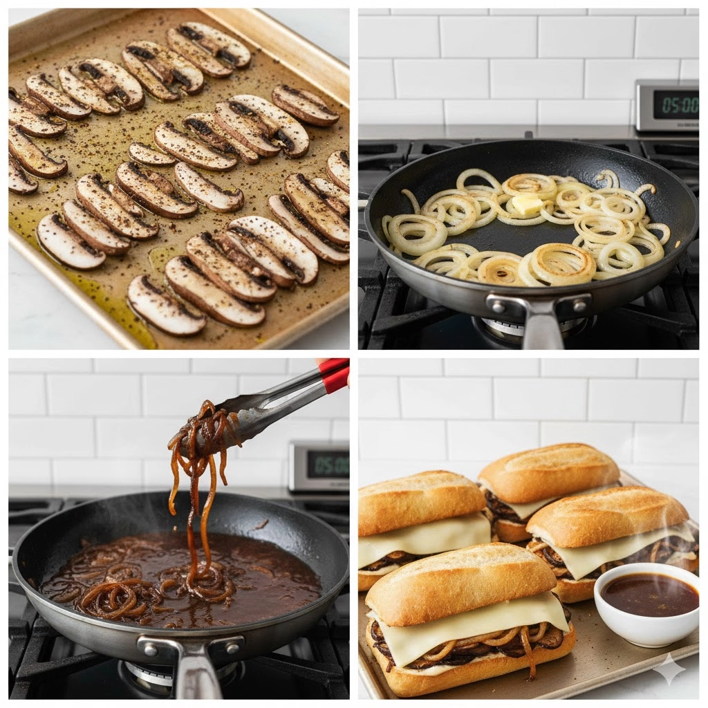 Don’t skip the second trip to the oven. Melting the Provolone directly onto the mushrooms helps bind the sandwich together. You want the bread to be sturdy enough to withstand being dunked into the broth, so a light toast is essential for structural integrity. The cheese acts as a moisture barrier, preventing the bread from getting soggy the moment the onions and aioli are added.