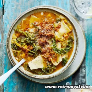 Minestrone has long been celebrated as the ultimate “kitchen sink” soup, a versatile and hearty Italian staple that adapts to the seasons and the contents of your pantry. However, this Red Pesto Minestrone Soup elevates the traditional vegetable-heavy broth by introducing the concentrated, sun-dried sweetness of red pesto. By incorporating savory cabbage, snapped lasagne sheets, and a rich tomato base, this dish transforms from a simple starter into a robust main course. It is a comforting, soul-warming bowl that balances the brightness of garden vegetables with the deep, umami-rich notes of Mediterranean herbs and parmesan cheese.