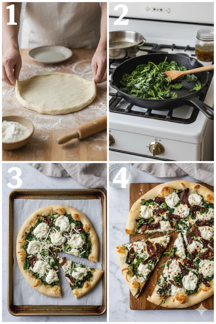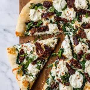This Ricotta Pizza is more than just a quick dinner; it is an exploration of how a few simple, high-quality ingredients can create something far greater than the sum of their parts. The combination of the garlicky wilted spinach, the sweet-tart sun-dried tomatoes, and the pillow-soft ricotta creates a harmony of textures that is hard to beat. It invites you to slow down, enjoy the process of stretching the dough, and savor a slice of handmade comfort. Once you master the technique of the ricotta dollop, you may never go back to standard red sauce again.