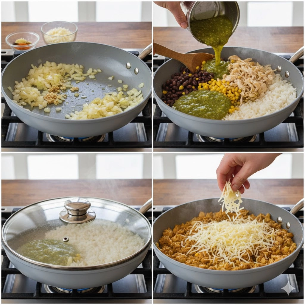 The success of any rice-based skillet dish lies in the ratio of liquid to grain and the control of heat. We use a 2 to 1 ratio of liquid (counting both the chicken broth and the moisture from the salsa) to the white long grain rice. Using long grain rice is essential here because the grains stay separate and fluffy rather than becoming sticky or mushy, which can happen with short-grain varieties.