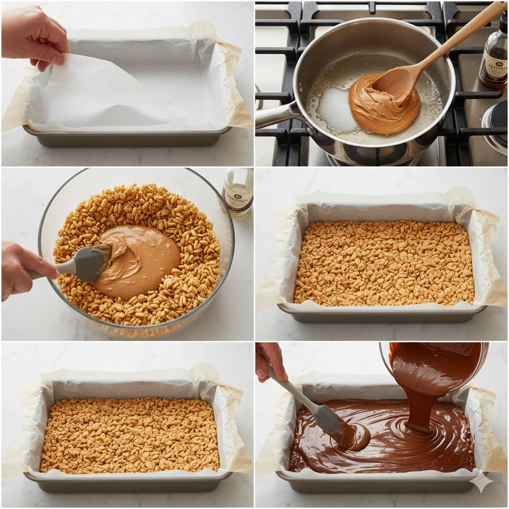This simple sequence ensures the perfect marriage of the sticky base and the creamy topping. Always work efficiently, as the base sets quickly once the peanut butter mixture is incorporated.