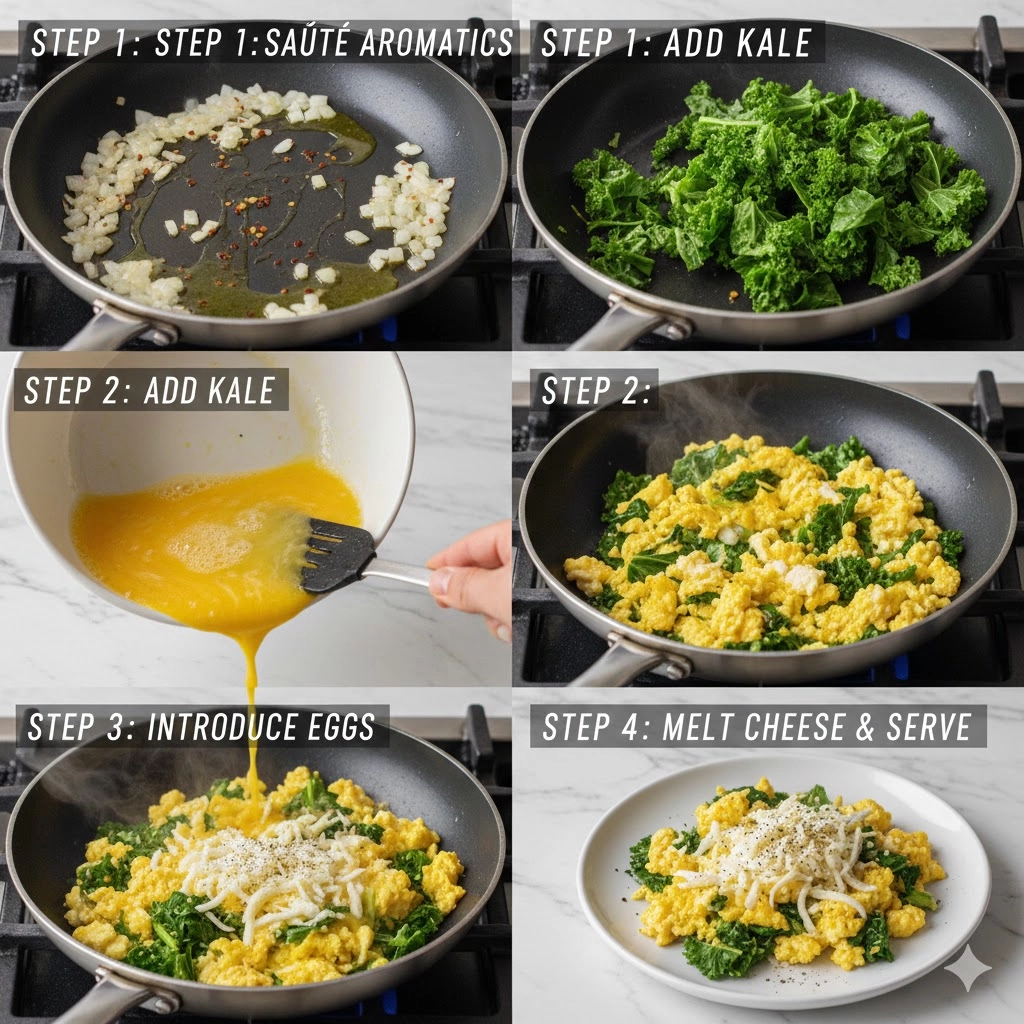 The secret to a world-class scramble lies in the heat management. When you move from sautéing the onions and kale on medium-high to cooking the eggs on medium, you are preventing the eggs from becoming rubbery or dry. Eggs are delicate proteins that prefer a “low and slow” approach, but since we are working with hearty kale, the initial high heat is necessary to break down the tough cellulose in the greens. By the time the eggs hit the pan, the kale should be tender but still possess a slight structural bite.