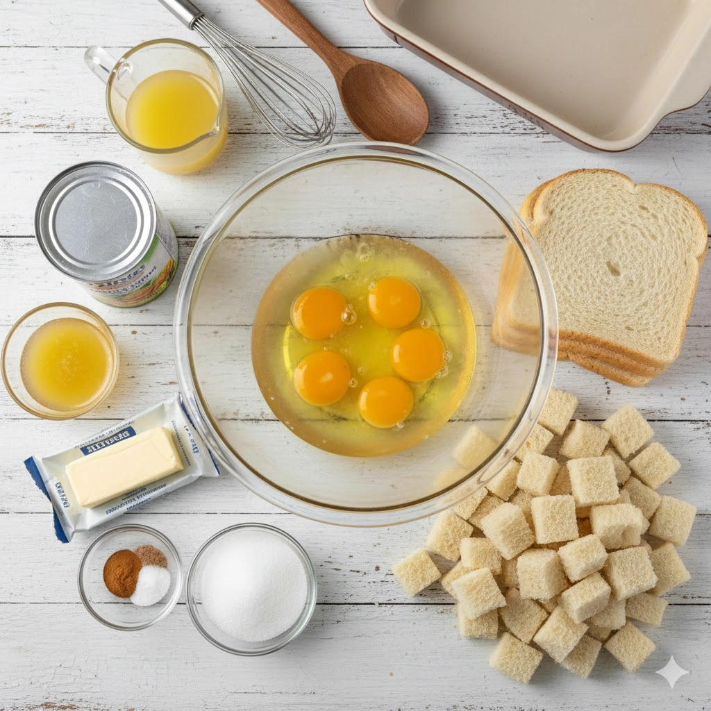 - Bread: Six cups of cubed day-old bread (white, brioche, or sourdough work best).
