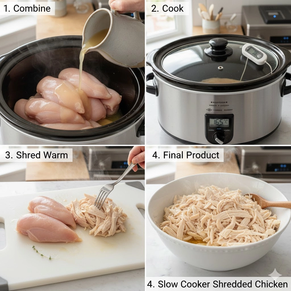 Once the chicken is shredded, it acts like a sponge. The liquid left in the bottom of the slow cooker is now a concentrated chicken essence. Drizzle about a quarter cup of this liquid back over the pile of shredded meat. This step is the secret to ensuring that even after a few days in the refrigerator, the Slow Cooker Shredded Chicken remains moist and flavorful rather than drying out.