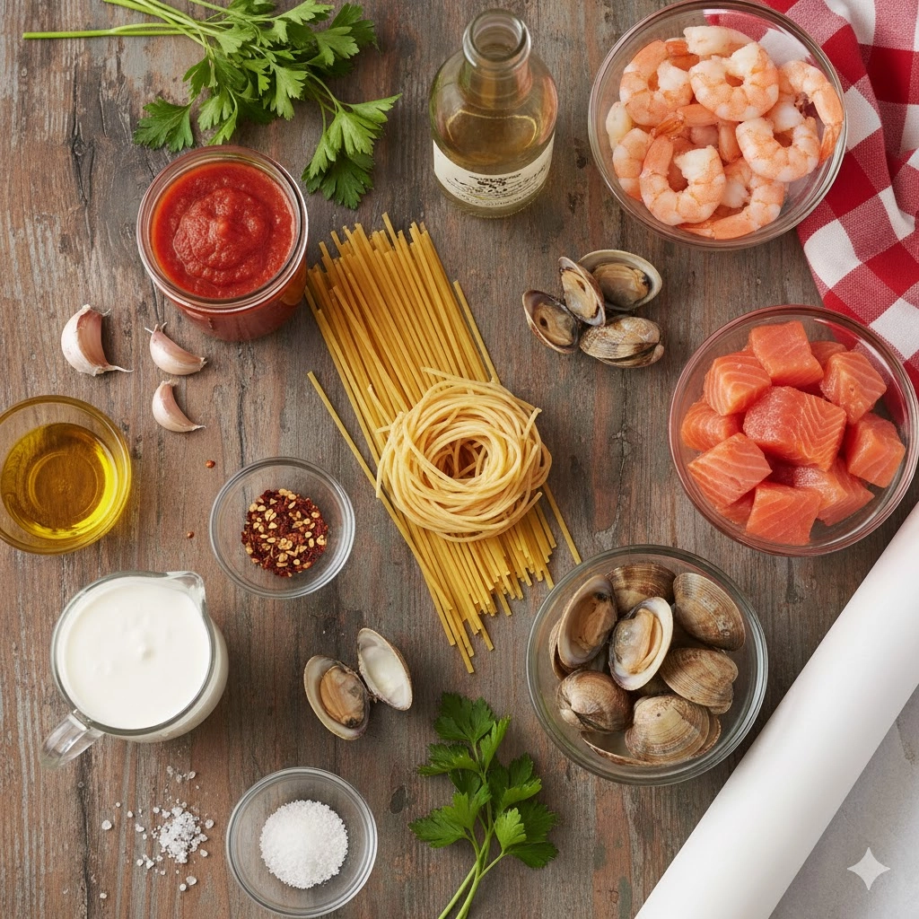 This preparation excels because it bridges the gap between stovetop tossing and oven braising. Unlike a traditional pasta bake that relies on melted cheese and a crispy crust, the parchment method focuses on moisture retention and flavor concentration. When the heat of the oven hits the liquid inside the pouch—in this case, a blend of marinara, dry white wine, and heavy cream—it creates a micro-environment of flavored steam. The clams open, releasing their natural juices directly into the spaghetti strands, while the shrimp and salmon remain remarkably tender. It is a sophisticated yet approachable way to serve a crowd without the last-minute stress of managing multiple pans on the burner.