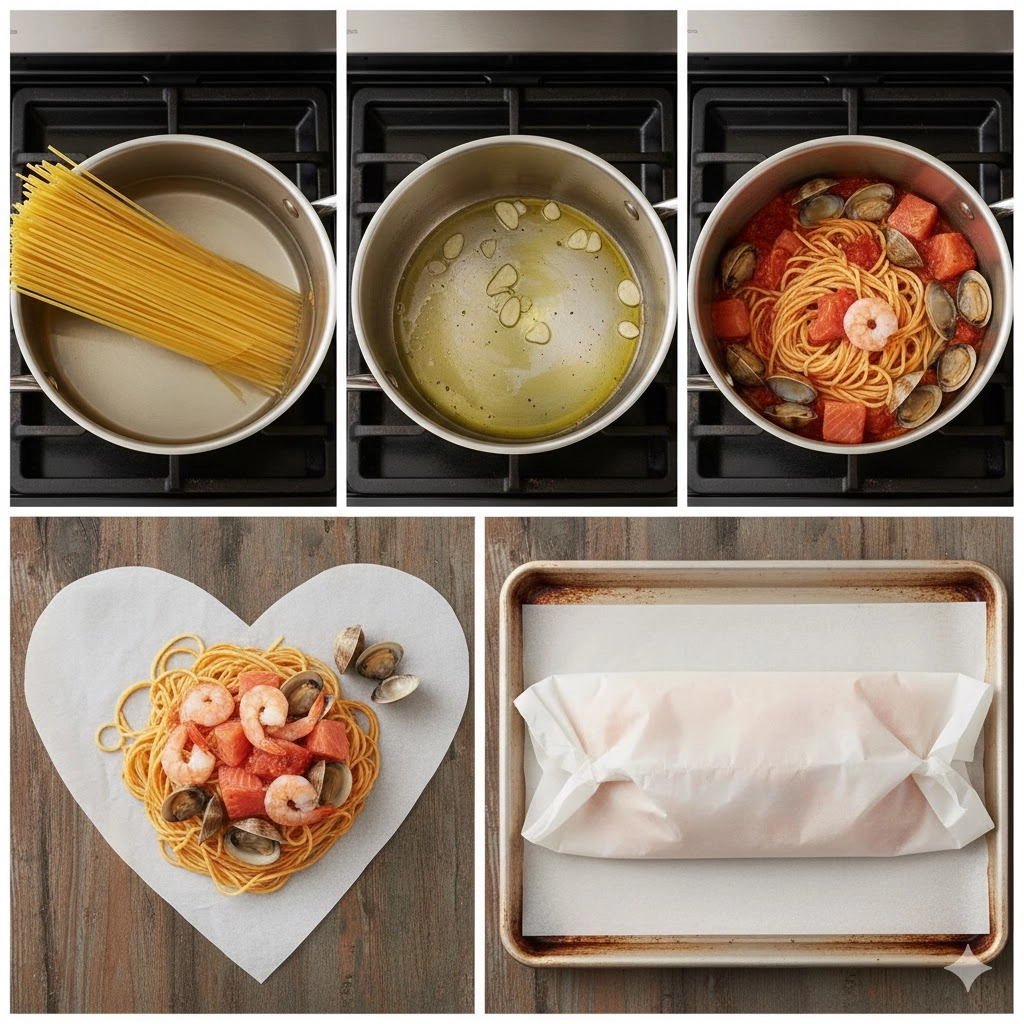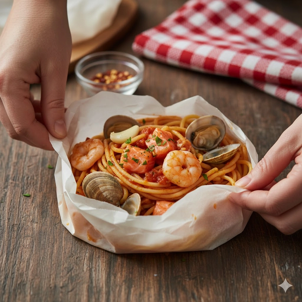 The culinary technique of steaming food within a parchment paper envelope—traditionally known as “en papillote”—is most frequently associated with delicate fillets of white fish or seasonal spring vegetables. However, applying this French method to pasta creates an entirely different sensory experience. By sealing par-cooked noodles inside a pressurized pouch with briny seafood and a rich tomato base, the pasta acts as a sponge, absorbing the volatile aromatics that would otherwise escape into the kitchen air. This Spaghetti en Papillote recipe transforms a standard seafood pasta into a dramatic, restaurant-quality presentation where each guest receives their own steaming parcel to unfurl at the table.