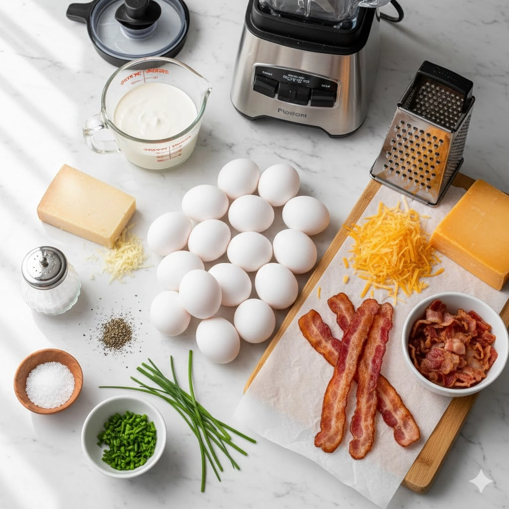 - Blend the Custard Base: In a blender or food processor, combine the eggs, heavy cream, salt, and pepper. Blend on high speed for about thirty seconds until the mixture is completely smooth and frothy. This aeration is key to the light texture.