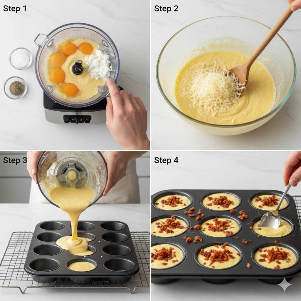 - Transfer the blended liquid into a medium-sized mixing bowl. Fold in the 1 cup of shredded Gruyere cheese, stirring gently to distribute the cheese evenly throughout the batter.