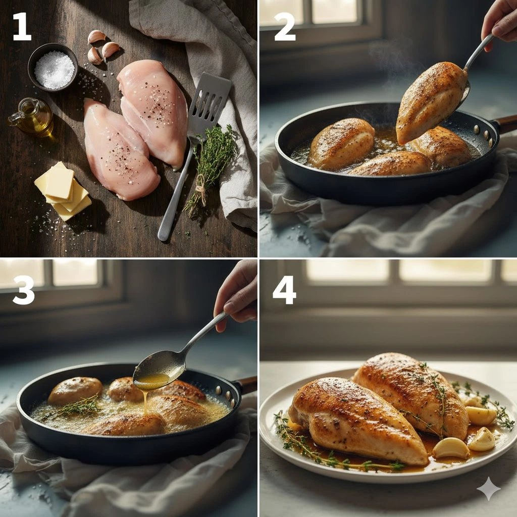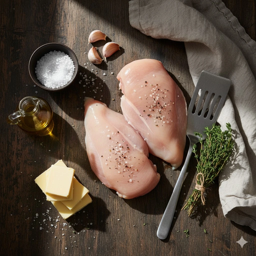 Gourmet Pan-Roasted Chicken Breasts: Two 8oz skin-on breasts, dry-brined 30 mins. Sear 7 mins/side in avocado oil. Baste with thyme-infused butter until 147°F internal. Rest 8 mins on chilled plate. Serves 2.